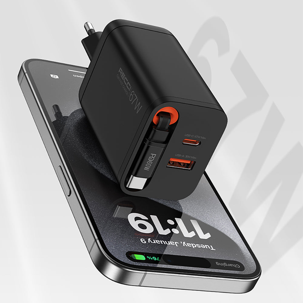 Recci RC103E GaN Teknolojili Hızlı Şarj Başlığı USB-A to Type-C PD 67W Type-C Kablolu Şarj Seti Siyah