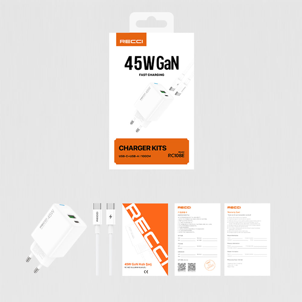 Recci RC108E, 45W GaN teknolojisiyle cihazlarınıza hızlı ve güvenli bir şarj sunar. Özel GaN çipi sayesinde enerji verimliliğini artırırken boyut olarak kompakt bir tasarım sağlar. Ofis, ev veya seyahat sırasında cihazlarınızı hızla şarj etmek için ideal bir çözümdür.